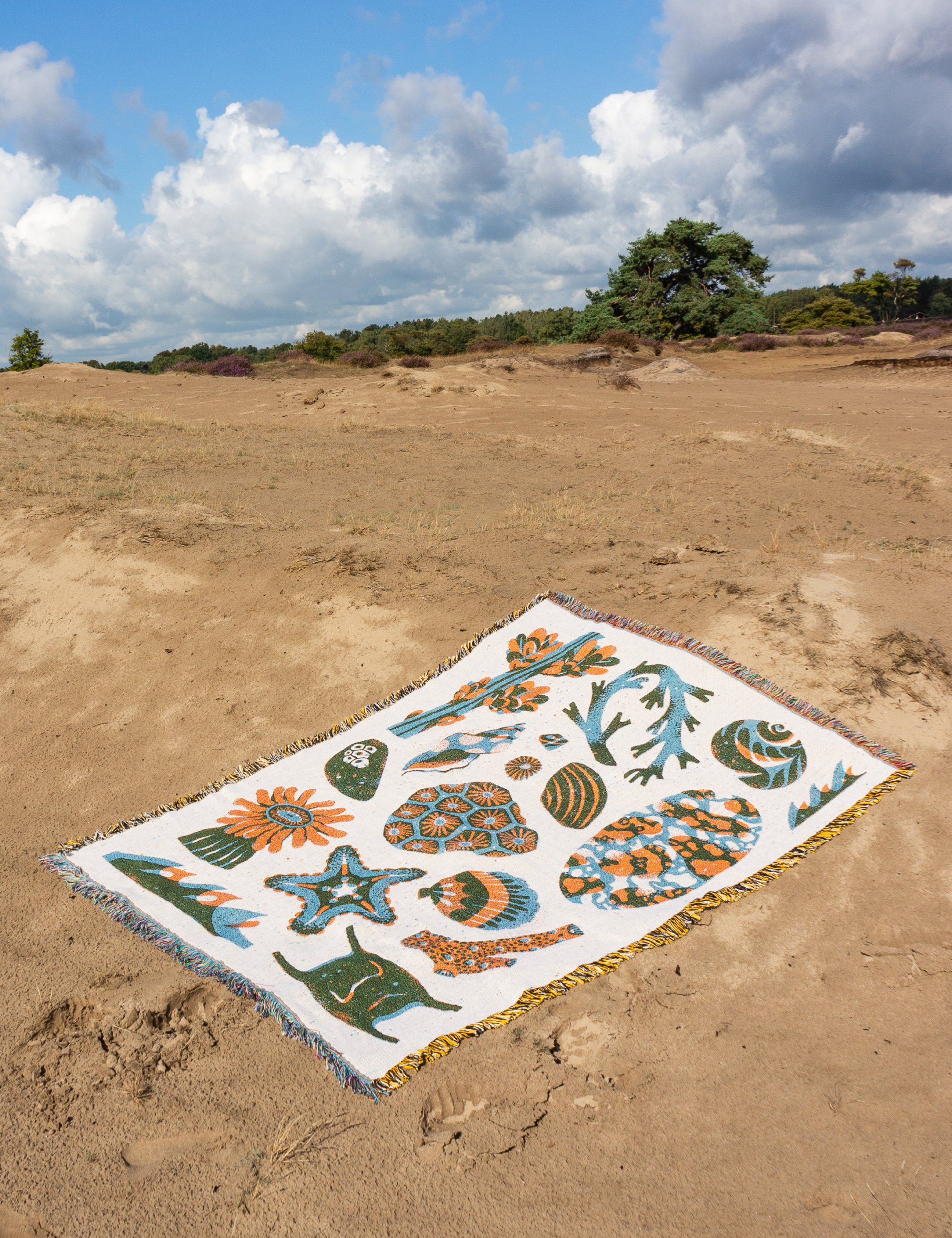 A Jacquard-woven blanket, themed around seaside findings, sustainably manufactured, made using a blend of 100% cotton and recycled cotton.